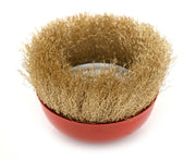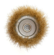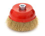 Professionell koppstålborste av hög kvalitet, tillverkad av mässingsbelagd, vågformad ståltråd. Utrustad med invändig M14-gänga och avsedd för användning med vinkelslip.